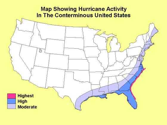 likely path that the hurricane will follow, and where it may strike land. - The picture above highlights the areas having the greatest amount of hurricane activity in the United States. Florida, Louisiana, and the Atlantic seaboard are at the highest risk. Areas further inland may receive increased amounts of rain associated with the hurricane (and sometimes tornadoes) which can pose a flooding threat. |