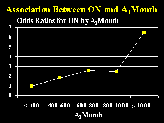 For overt nephropathy a small increase in risk is seen up to 1000 A1months when again a dramatic increase in risk is noted.