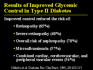 Similar data are difficult to find for Type 2 diabetes, however, the Kumamoto study from Japan which examined relatively thin Type 2 diabetics showed encouraging results for the microvascular complications. The 54% reduction in macrovascular events however should be interpreted cautiously as only 5 individuals in the whole study had macrovascular events. Whether lowering blood sugar will improve the macrovascular outcome of Type 2 diabetes is less clear.
