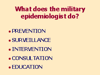 his care requires him to place emphasis on certain aspects of the job. The following slides describe some of the activities that the military epidemiologist performs on a day-to-day basis.