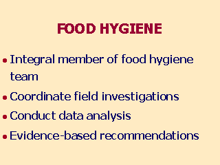 The food hygiene team is usually of multidisciplinary background, and may include veterinarians, public health officers, food hygienists, a dietician and an epidemiologist. Case-control studies are commonly conducted in order to investigate potential links between enteric illness and consumption of one or more specific food items. The epidemiologist, in conjunction with the other members of the team, may make recommendations for future prevention based on the team’s findings.