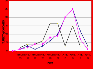 WATER TURBIDITY AND DISEASE LEVELS. LEGEND: Water turbidity (black line) is measured in Nephelometric turbidity units. Disease levels are presented as number of cases per day: Lab. Survey =blue line; Telephonic survey = pink line). The Southern water plant was closed on april 8, 1993. Data derived from MacKenzie et al., 1994. New Engl. J. Med., 331: 161-167