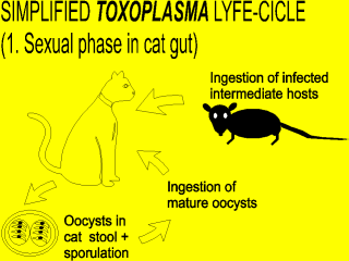- The final result of sexual process ocurring inside intestinal cells is a cystic stage coming from zygote: the oocyst. -Young cats are prone to infection, which usually shows only mild symptoms. - Once cat develops immunity, reinfection is unlikely or yielding a very low oocyst production - Cats can act also as an intermediate host (but in this sense is an unlikely source of infection). |