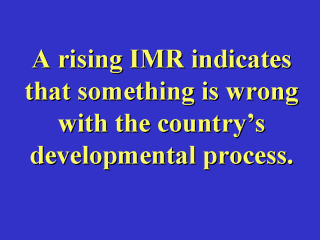 medical conditions, (immaturity, congenital abnormalities, etc.). A rapidly declining IMR indicates that there is probable improvement generally in social and environmental conditions. |