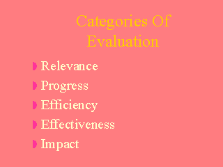Progress-refers to the tracking of the activities. Efficiency-refers to whether the program results could be obtained less expensively. Effectiveness-refers to whether the program results meet predetermined objectives. Impact-refers to the long-term outcomes of the program.