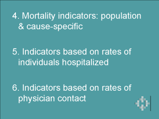 were not included in the original set are important indicators. Two types of indicators are derived from contact with the health care system: 5. Hospitalization-related indicators – four categories of hospitalizations: injury, cancer, chronic disease, and infectious disease. 6. Physician contact-related indicators – for various medical conditions associated with disability and social functioning. |