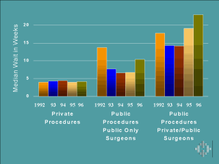 - For surgeons with both public and private practices, the wait was about 14 weeks in 1993