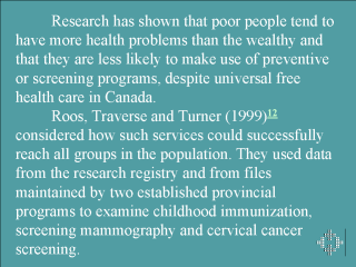 Each of the three services studied are organized differently in Manitoba: 1. Childhood Immunizations - provided through a longstanding provincial program. The Manitoba Immunization Monitoring System records all immunizations of provincial registrants (as of Jan 1, 1980) and provides monitoring and reminders to families. 2. Screening Mammography - provided through a newly established (1996) provincial program: Manitoba Breast Screening Program. The Program contacts women directly for screening, rescreening, and sends out reminder notices if necessary. 3. Cervical Cancer Screening – there is no provincial program; services are provided by physicians, approved laboratories, and in the North (independently) by nurses. These services were compared on their overall population coverage, and the difference in access by residents of the wealthiest (Q5) versus poorest (Q1) income quintiles in 1990 and 1996. The income quintile difference is represented by the Q1/Q5 ratio. |