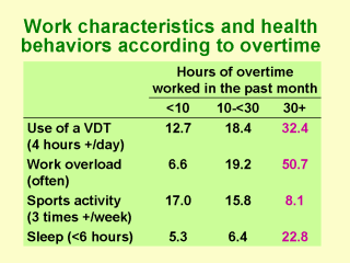 | As expected, subjects who had worked overtime for 30 or more hours tended to work with video display terminal (VDT) and frequently perceived work overload. They were less likely to engage in regular sports activities and had fewer hours of sleep. |
