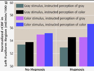it was color or gray, they had a higher level of blood flow appropriate for color vision. What happens now with hypnosis? If you’re seeing gray and you’re told you see in color, the blood flow went up to that of the level of color perception; and if you’re seeing color and you’re told, under hypnosis you are to see color, the level went up even further. This suggests that the brain is acting as if what you’re told to see is what you’re seeing. |