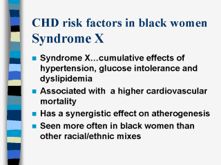 African American women may be particularly vulnerable to CHD as a result of diabetes, not only because of their increased prevalence relative to other race/gender mixes but also because of the cumulative effects of hypertension, glucose intolerance and dyslipedemia, commonly known as syndrome x (18). Persons with diabetes are also more likely to have hypertension and dyslipidemia, both of which are associated with a higher cardiovascular mortality. This syndrome has a synergistic effect on atherogenesis and is typically seen more often in blacks, particularly black women (18). Diabetes has also been implicated as a possible etiology of the increased incidence of CHD in young black women. Animal studies have suggested that hyperglycemia and hyperinsulinemia-insulin resistence prevent the cardiovascular protective effects of estrogen. Because black women have a higher incidence of both diabetes and obesity relative to white women, this mechanism may eliminate the protection from CHD that female sex normally provides (19).