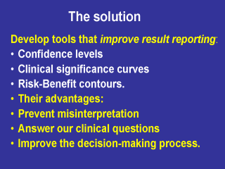 New tools such as confidence levels, clinical significance curves, and risk-benefit contours have been postulated as potentially improving result reporting (Ref 1, 16-19). These tools, which are based on confidence intervals, can help prevent result misinterpretation, answer the questions we have of the data, and improve decision-making based on study results. 1. T.P. Shakespeare, V.J. Gebski, M.J. Veness, J. Simes, Improving interpretation of clinical studies by use of confidence levels, clinical significance curves, and risk-benefit contours, Lancet 357 (2001) 1349–53. 16. P. Landais, J-P. Daures, Clinical trials, immunosuppression and renal transplantation: new trends in design and analysis, Pediatr. Nephrol. 17 (2002) 573-584. 17. G. Bouvenot, P. Villani, P. Ambrosi, Critical review of the publication of a clinical trial, Presse. Med. 31 (2002) 1061-1068. 18. G. Bouvenot. How to minimize the therapeutic risk, Rev. Med. Interne. 22 (2001) 1237-1243. 19. A. Hernandez Jerez, From case report to epidemiological evidence of causality in biomedical research, Arbor 171 (2002) 589-608. |