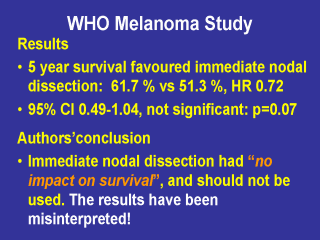 The study results found that immediate dissection had the best 5 year survival: 61.7% vs 51.3% for observation: the hazard ratio was 0.72. However this was not statistically significant This is reflected by the 95% confidence intervals, which cross 1. The authors concluded that immediate dissection had no impact on survival, and that it was ineffective and should not be used. They have misinterpreted their own results! |