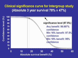 This is the clinical significance curve for survival which reflects the significant results found. One can see that there is high confidence for a survival benefit of up to 20% or so. |