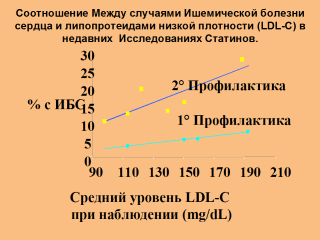 Ишемической болезни сердца и липопротеидами низкой плотности (LDL-C) в недавних Исследованиях Статинов. Недавние испытания статинов , которые включали данные 30,817 пациентов, продемонстрировали почти линейное соотношения между уровнями LDL-C и коронарными случаями. Данные из исследований по первичной профилактике (WOSCOPS) и по вторичной профилактике(CARE, 4S) продемонстрировали, что пониженный уровень LDL-C связан с меньшим количеством коронарных событий. Данные из двух недавних исследований ( Воздушные силы / штат Техас Профилактика коронарного атеросклероза (AFCAPS/TexCAPS, первичная профилактика) и Долгосрочное Вмешательство с Провастатином при ишемической болезни (ЛИПИД, вторичная профилактика)) показывали сходные хорошие результаты лечения статинами по снижению риска ИБС у пациентов со средними уровнями липидов. Два главных заключения могут быть отмечены по этим инновационным испытаниям: - Снижение уровня LDL-C уменьшает число коронарных событий, без существенного увеличения несвязанной с сердечно-сосудистой системой показателя смертности (смертность от всех причин). - Выгоды от снижения LDL-C могут быть распространены на население, которое включает лиц с и без ИБС, имеющих средние уровни холестерина. Шеферд Дж. и др . N Engl J Med. 1995; 333:1301-1307. |