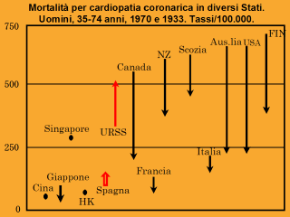 Mortalità per cardiopatia coronarica in diversi Stati, nei maschi da 35 a 74 anni, nel 1970 e nel 1993. Tassi/100.000. Questo grafico mostra l’aumento osservato nei Paesi ex-sovietici, e in altri, nella mortalità per cardiopatia coronarica. La principale ragione di quest’aumento sta nel crollo del sistema sanitario pubblico nell’ex Unione Sovietica. FIN: Finlandia HK: Hong Kong NZ: Nuova Zelanda Fonte: NIH http://www.pitt.edu/~super1/lecture/lec4091/006.htm Dr. Ueshima, Professor and Chairman, Department of Health Science, Shiga University Medical Science, Japan |