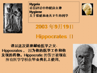 Hippocrates, (460-377 ? BC ), 希腊的一个非凡的医学作家。很少听说他在作为 Cos 岛上医生以外的生活,他生活在希腊历史上的繁荣时期, Hippocrates 是那个时代仅有的,不相信迷信的一个人。超过 80 篇论文被归功于他,但是现在有人相信其中一些是别人借用了他的名字和名声写的。他的成就包括  10 卷著作 和 一部当时非常著名的医学和外科百科全书 。他被称为了医学之父。他不相信奇迹般的疾病痊愈。他认为适当的饮食是健康的必需品,气候对精神和肉体有深刻的影响。 在 Thessaly 他死于高龄 。