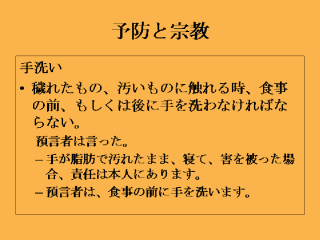 病気予防や衛生の習慣は、非常に長い歴史があります。衛生の習慣は宗教、宗教儀式と関連のあることが多く、このスライドはイスラム教の例ですが、キリスト教、ユダヤ教、ヒンズー教等、他の多くの宗教にも存在しています。