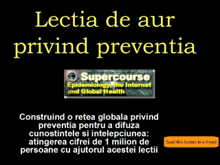 "O uncie de preventie valoreaza cat o uncie de vindecare" (1 uncie=28 grame) Henry De Bracton, 1240Valoarea profilaxiei primare este cunoscuta omenirii de mai multe secole. Din pacate, chiar si astazi beneficiile ei nu sunt intotdeauna recunoscute datorita preocuparilor privind tehnologia de varf in medicina moderna. Noi, cei din cadrul proiectului Supercourse (www.pitt.edu/~super1) am ilustrat importanta preventiei prin elaborarea "Lectiei de aur privind preventia". Supercourse, finantat de catre Biblioteca Nationala a Medicinei, este o biblioteca on-line de lectii privind preventia si sanatatea publica, distribuita gratuit de 10.000 de membri din 151 de tari care fac parte din Reteaua Globala a Sanatatii. Am realizat o "Lectie de aur privind preventia" pentru a ilustra si a scoate in evidenta rolul preventiei in procesul continuu de a face planeta noastra mai sanatoasa. Nota:butonul "send this lecture to a friend" functioneaza numai in programul Power point. Aceasta lectie a fost realizata de Faina Linkov, MPH cu ajutorul grupului Supercourse din Pittsburgh, PA si al Retelei Globale a Sanatatii. Lecture was translated into Romanian by Sorin Ursoniu, Department of Public Health & History of Medicine at the "Victor Babes" University of Medicine & Pharmacy, Timisoara, Romania |
