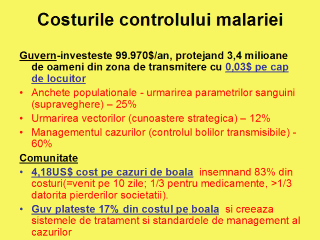 Controlul malariei este o preocupare serioasa a specialistilor din domeniul ingrijirilor sanitare din provincia Henan din China. Diapozitivul prezentat arata ca in acest exemplu costul per persoana bolnava este de peste 100 de ori mai mare decat costul preventiei. http://www.pitt.edu/~super1/lecture/lec5501/008.htm Profesor Xi-Li Liu, TDR/OMS Project Principal Investigator Institutul de boli parazitare a provinciei Henan, China |