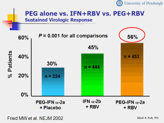 | The SVR, the holy grail of HCV response, was almost twice that than PEG alone and significantly better than the current gold standard at that time, which was IFN + RBV. Again, the psychological barrier of 50% has been broken finally. |