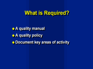 required; usually, however, there are many others. The quality manual must contain a quality policy, which is understood by all staff. The QMS documentation must document all key areas of activity of the organisation. |