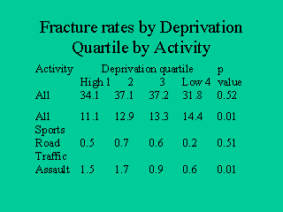 | This slide shows the fracture rates by deprivation quartile for all fractures, all sports related fractures, road traffic related fractures, and those caused by assaults. The high deprivation quartile refers to the most deprived quartile with a Townsend score of 6.3 in the earlier slide. |