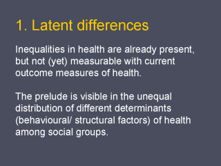 literature focuses mainly on two different explanations: The first one is the hypothesis of latent differences. In general it’s difficult to verify socioeconomic differences in health in adolescence, because young people have a good health status. So this hypothesis supposes that in health are already present, but not (yet) measurable with current outcome measures of health. The prelude is visible in the unequal distribution of different determinants (i.e. behavioural/ structural factors) of health among social groups. |
