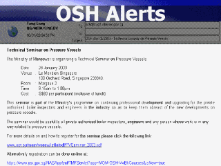 | A recent feature that has proved popular is the “OSH Alert” free subscription service. E-mail notifications are sent to interested professionals and provide updates on training courses, promotional events and case studies, as well as new legislation and policies. |