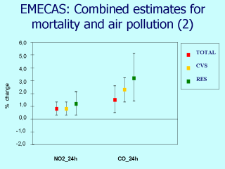 01. Single pollutant models NO2 and CO also showed this pattern with higher estimates for specific causes, for NO2 we found an association of 0.6, 0.8 and 1.2 % increase in total, cardiovascular and respiratory causes, respectively. An increase on 1mg/m3 of CO was associated with a 1.5, 2.3 and 3.2 % in total, cardiovascular and respiratory causes, respectively. Ozone only showed statistical significance with cardiovascular mortality (Saez, et al). When two pollutant analyses were performed, estimates for all pollutants did not substantially modify, except for SO2 where estimates for daily levels were strongly attenuated. On the contrary, the association for one-hour maximum levels of this pollutant did not show any change. |