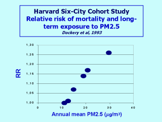 | Cohort studies Although in less number than time series studies, there are several cohort studies about the impact of pollution on health, the first one is known as the six cities study. In it, a group of 8111 adults from six United States cities were followed in 1974, (Dockery et al., 1993). Results show that, once controlled for smoking habit and other risk factors, mortality indices are associated with air pollution. Death risk in the most polluted cities was 26 per cent higher compared with those with lower pollution. |