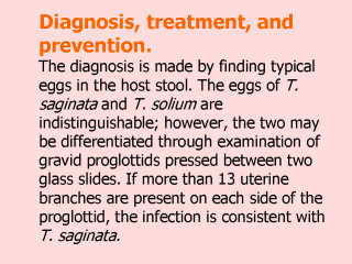 | The treatment of choice for T. saginata infection is a single 5-10-mg/kg dose of praziquantel. However, this medicine is controversial. Two hours after treatment, a purgative should be given to eliminate ova. Prevention of T. saginata infection occurs at two levels. First, soil contamination in areas of cattle grazing must be prevented. Second, beef should be adequately cooked to kill all larvae. |