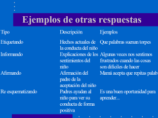 aplicados. A) el primer relato de interés que etiqueta la conducta del niño B) el segundo enunciado de interés que sirve para informar a los niños acerca de la naturaleza de sus sentimientos C) el tercero asegura su posición para con sus padres D) re esquematizando Ciertamente otros tipos de enunciado pueden ser hechos, pero presentamos esos con la idea de que los padres lo hagan simple, para que los niños con la ayuda de los enunciado interpreten mejor sus experiencias |