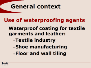 | Waterproofing agents are used in a wide range of applications. It is commonly spread over leather and textile as a protective coating. It may also be used as stain repelling agent on porous stones (i. e. tiles). |