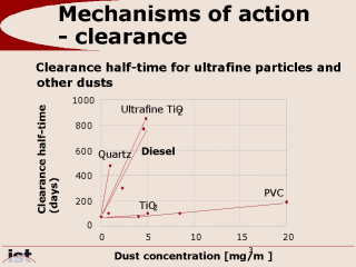 It is interesting to see that the celarance half-time is quite dependent on the size of the particulates as shown for TiO2. Diesel appears of this slide as close to ultrafine TiO2, confirming that its particulate phase in the size range of very small particles. The smaller the size of the particulate is, the longer is its residence time in the lung. Reference : J.W.Cherrie Occupational Hygiene 1998, 11