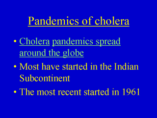 Since the 1800’s cholera pandemics have spread around the globe The link shows a map illustrating the spread during one pandemic. Most have started in the Indian Subcontinent. The most recent started in 1961 and is still on-going having affected at least 100 countries. |