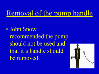 “I had an interview with the Board of Guardians of St. James's parish, on the evening of Thursday, 7th September, and represented the above circumstances to them. In consequence of what I said, the handle of the pump was removed on the following day." Quote from John Snow. The link shows more information about the pump including a photograph of a replica on Broad Street with it’s handle removed.