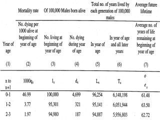 | EXAMPLE: 100,000 births ( row 1, column 3) have an infant mortality rate of 46.99/thousand (row 2, column 2), so there are 4,699 infant deaths (row 3, column 4). This leaves 95,301 left (100,000 – 4,699) to begin the second year of life (row 2 column 3). |