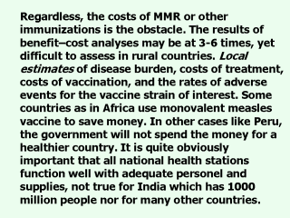 | The next point is COVERAGE of the vaccine. Try for 95 % of the population. Why are measles outbreaks current in colleges? Because the familiar combination of predator and susceptible host is often encountered, although these are adults. These victims were not indirectly protected. They had escaped childhood infections because of low prevalence of the measles virus in their neighborhoods and were never vaccinated. |