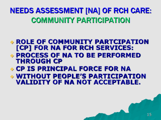 | IN FACT THE ENTIRE PROCESS OF NA FOR RCH FIELD IS COMPULSORILY TO BE PERFORMED THROUGH CP WHICH IS VERY ESSENTIAL AND BASIC PRINCIPAL OF THIS NEW APPROACH. IN THIS CONTEXT COMMUNITY PARTICIPATION IMPLIES PARTICIPATION OF THE CLIENTS IN VILLAGES, LOCAL LEADERS, SCHOOL TEACHERS, LOCAL WOMEN’S GROUPS, VOLUANTARY AGENCIES AND THE BADY CALLED’PANCHAYAT’ WHICH IS AN ELECTED BODY OF THE VILLAGERS. |
