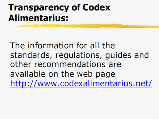 Spanish language. The information for all the standards, regulations, guides and other recommendations are also available on the web page http://www.codexalimentarius.net as well as on CD-ROM. All information about all relevant meetings, as well as other important events connected to the work of Codex Alimentarius can be found on the web page. |