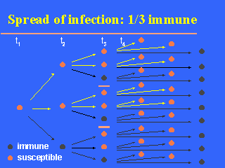 immune due to vaccination or previous natural exposure to the microorganism. The spread of the infection is interrupted (black lines in the slide) when the infectious cases contact (in a way that can potentially transmit the disease) an immune rather than a susceptible person. On average, this will happen in one in three contacts (as we assumed that 1/3 persons in the population are immune). Therefore, a number of susceptibles will be indirectly protected from infection just because their neighbour is immune. |