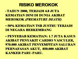 Rokok telah membunuh hampir 5 juta orang setiap tahun. Tahun 2000, rata-rata terjadi 4.8 juta kematian dini (premature death) di dunia akibat merokok, 50% diantaranya dilaporkan dari negara-negara berkembang, 50% lagi dilaporkan dari negara-negara industri. Penyebab kematian: 1.7 juta akibat cardio vasculer diseases seperti stroke dan jantung coroner, 970,000 akibat penyempitan saluran pernafasan akut dan 850,000 lainnya akibat kanker paru-paru. (Majid Ezzati (Harvard School of Public Health) dan Alan Lopez (Queensland Univ. Australia) |