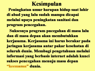 Kita sekarang sudah memasuki abad ke 21. Penting buat kita untuk tidak melupakan konsep yang sudah dikembangkan oleh Hippocrates yaitu: “positive health”. Dia mengembangkan konsep positive health dengan penjelasan sbb: Untuk bisa mengembangkan “positive health”, dibutuhkan pengetahuan tentang komposisi tubuh manusia yang disebut gene. Selain itu, dibutuhkan juga pengetahun tentang tenaga (energi) yang diperoleh dari makanan, baik yang bersifat alami maupun yang diproduksi oleh industri makanan (processed food). Tetapi kalau kegiatan manusia hanya diisi dengan makan saja, belumlah cukup untuk menjaga kesehatannya. Harus juga dibarengi dengan olah raga. Bagaimana manfaat olah raga terhadap kesehatan tubuh manusia sudah sama-sama kita fahami. Kombinasi dari keduanya akan membangun kompisisi tubuh manusia, apalagi kalau disesuaikan dengan perubahan musim, umur, dan situasi lingkungan di rumah. Jelasnya, jika terjadi gangguan konsumsi atau proporsi olah raganya, manusia akan mudah terserang penyakit. |