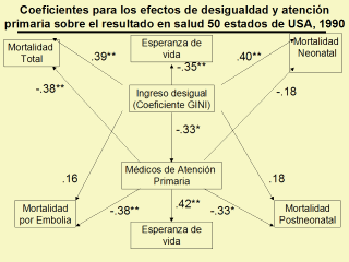 | *p<.05; **p<.01. Elevados razones de m édicos de atención primaria a la población están asociados especialmente con menor mortalidad por accidente vascular cerebral y mortalidad postneonatal. La razón de desigualdad del ingreso y médico de atención primaria para la población,están asociados, mostrando que las políticas sociales y de salud en estados individuales van juntos; entre mejor uno, mejor el otro.Fuente: Shi L, Starfield B, Kennedy BP, Kawachi I. Income inequality, primary care, and health indicators. J Fam Pract 1999; 48(4):275-284. |