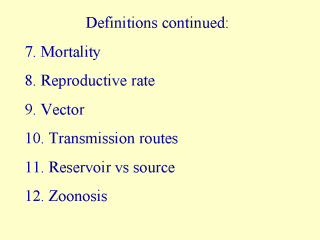 8. Reproductive rate: potential for an infectious disease to spread. Influential factors include the probability of transmission between an infected and a susceptible individual; frequency of population contact; duration of infection; population immune proportion . 9. Vector: source (i.e. mosquito or tick) which harbors infectious agent and transmits it to susceptible individuals. 10. Transmission routes: direct (mucous membrane to mucous membrane, cross placental, blood or tissue, skin to skin, sneezes or coughs) and indirect (water, air borne, food borne, vectors or objects). 11. Reservoir: ecological niche (vs source which is the actual object). 12. Zoonosis: infections that can spread from vertabrate animals to man. |