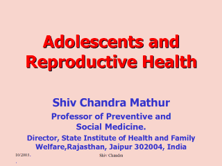 largest state of India. Dr.Shiv Mathur is deeply involved in implementing the HRD component of RCH project (funded by World Bank/UNFPA/European Commission) in India. He has earlier contributed three lectures to the Supercourse on different components of Reproductive Health which are available on the same website. Half of the world’s population currently is less than 25 years age and 20% of population is in second decade of life. In this context, knowing about adolescents and their reproductive health is relevant. |