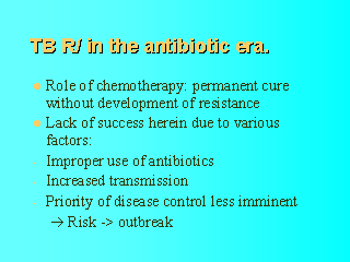 permanent cure without development of drug resistance. Chemotherapy has proven very effective in making TB a rare disease in Western Europe and industrialized countries, but unsuccessful in eliminating TB. The causes responsible are legion: *improper use of antibiotics leads to drug resistance, *HIV infection facilitates transmission of TB, *decreased priority of disease control increases the possibility of an outbreak. |