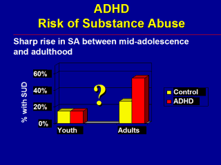 follow-up—15 years Dramatic increase in PSUD between mid-adolescence and young adulthood. This is the high-risk time-frame in which many individuals leave the domain of their parents, go off to college, etc. In a study by Wilens et al, ADHD was associated with Association between ADHD and early onset of smoking and substance abuse indicates prevention and early intervention programs should be focused on this group. Wilens et al. Am J Addict 1998;7:156. |