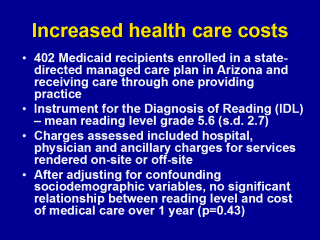 | Weiss BD, Blanchard JS, McGhee DL, et al. Illiteracy among Medicaid recipients and its relationship to health care costs. J Health Care Poor Underserved 1994;5:99-111. |